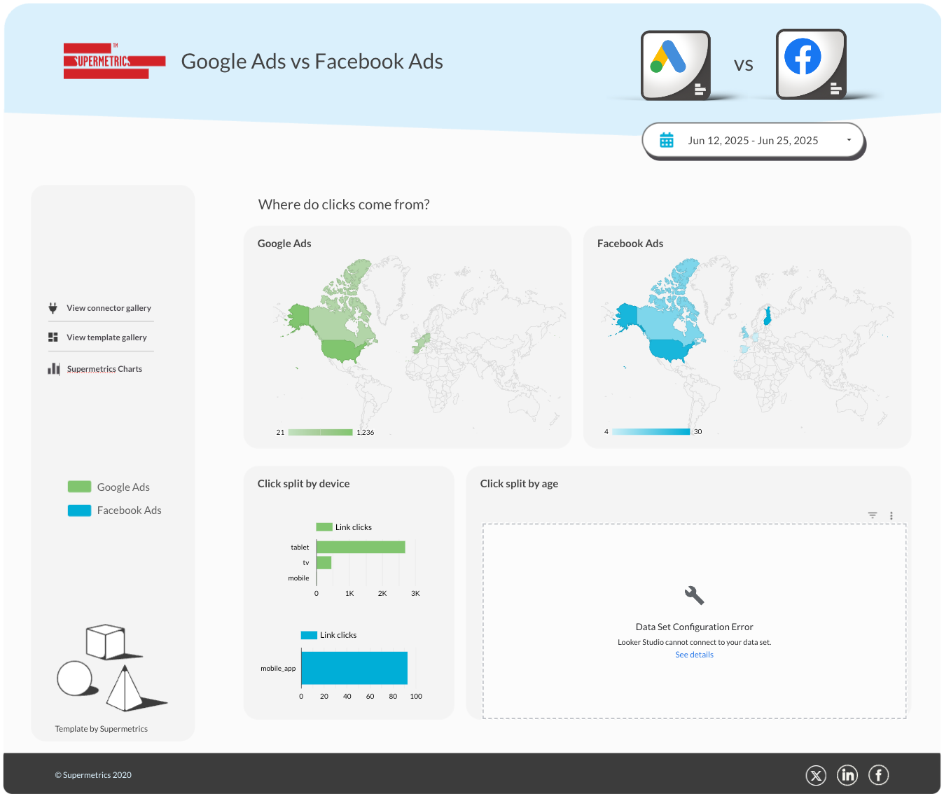 Compare Google Ads and Facebook Ads performance in one dashboard. Track spend, clicks, ROAS, and more to see which platform drives better results. Try the free Looker Studio template.