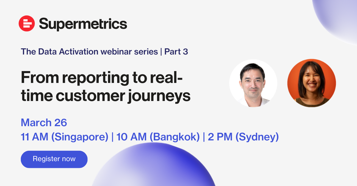 Join us for the third and final webinar in our three-part series on Supermetrics Data Activation, where we explore how Data Activation becomes the missing link between your unified data and real-time marketing action.